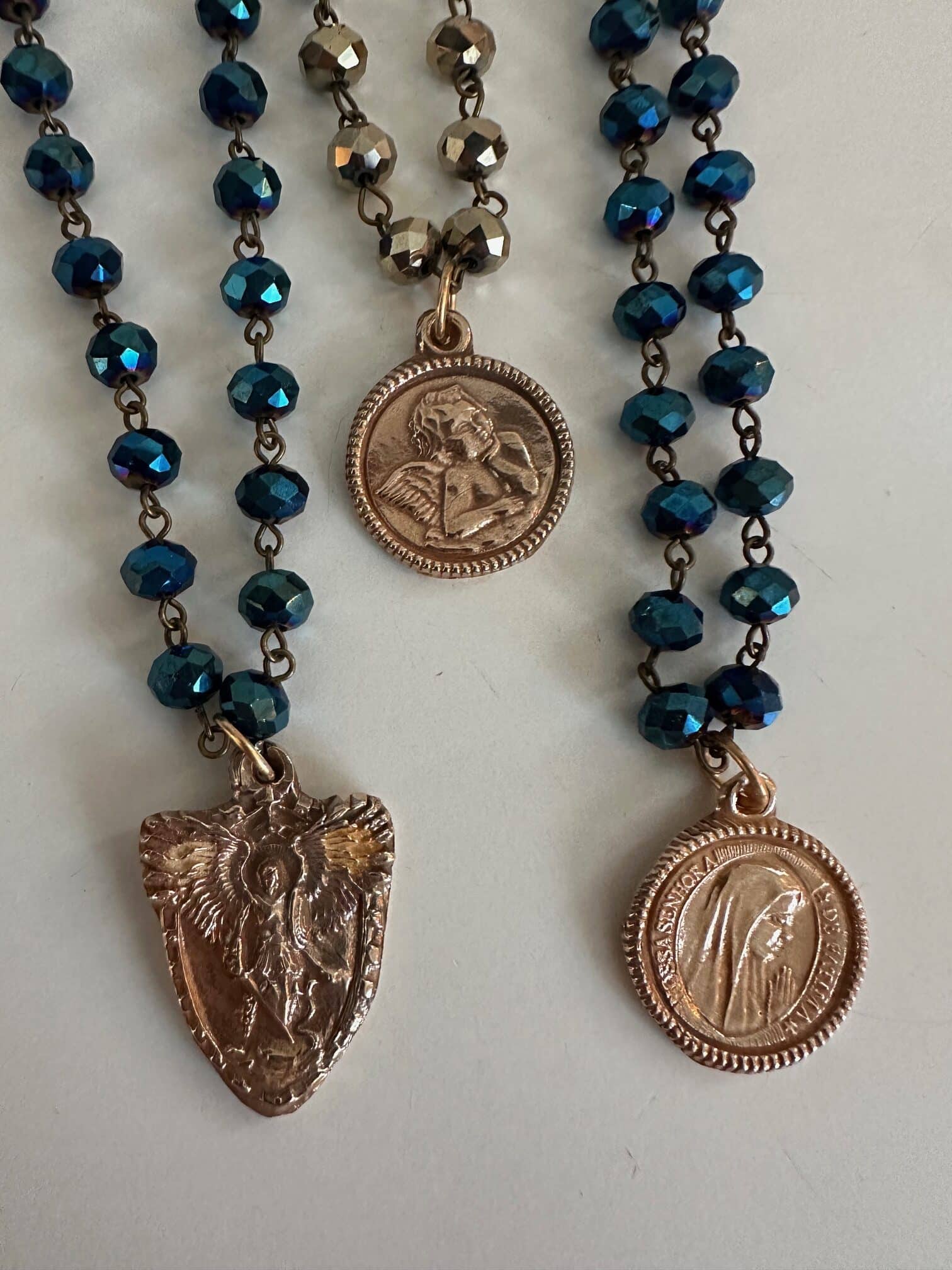 Archangel Michael is the angel that protects and guards and also helps assist in removing anything that no linger serves your highest good. Cast bronze hanging on glass rosary style beaded chain 18 inches long. Far left in the photo on dark blue chain.