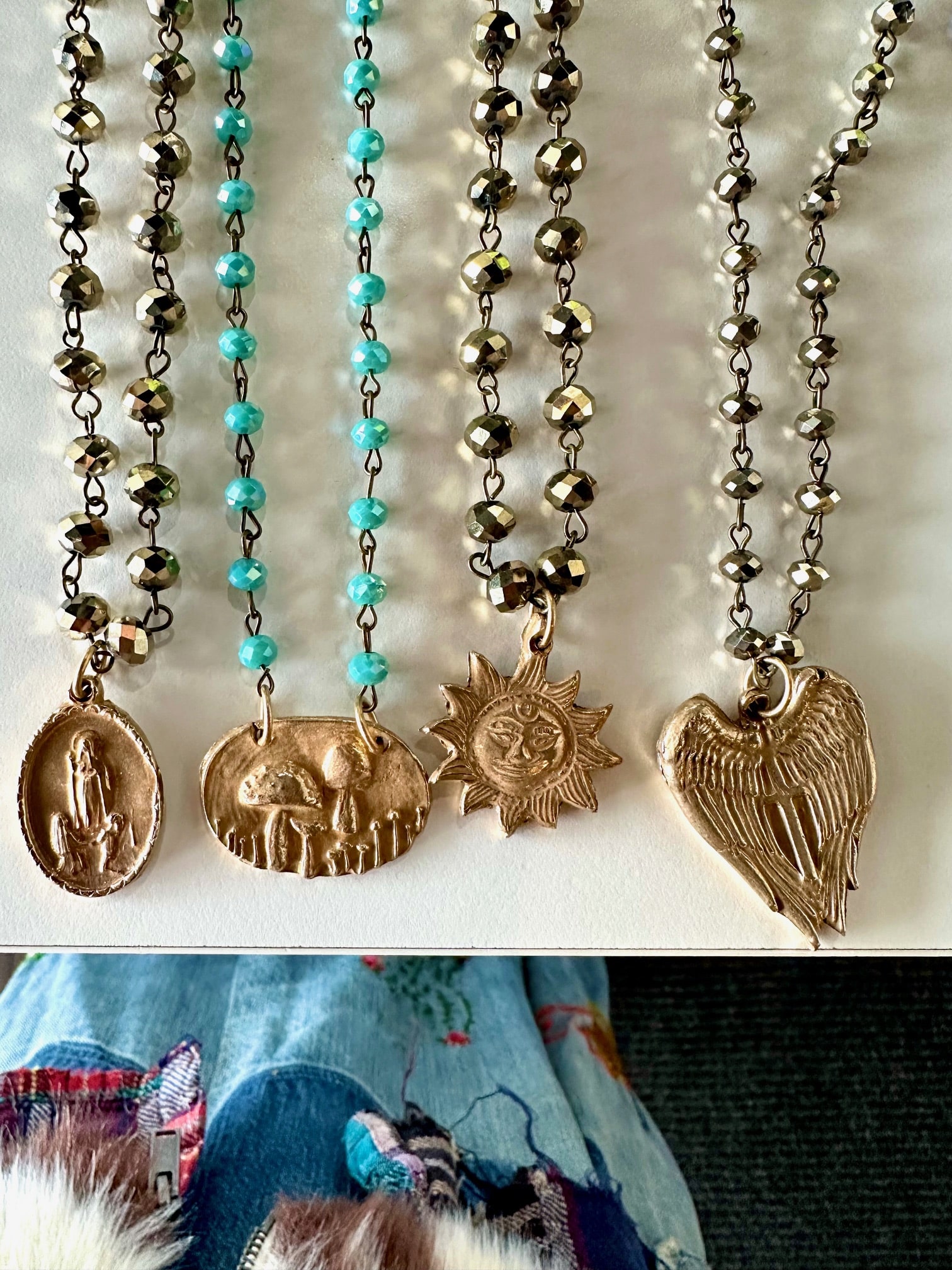 Beautiful new version of the SMILING SUN in caste bronze!!! Follow the Sun necklace is a roughly quarter sized casting of the sun with golden beaded rosary chain and just lights you up!!! Get yours. Third from the left in the photo.